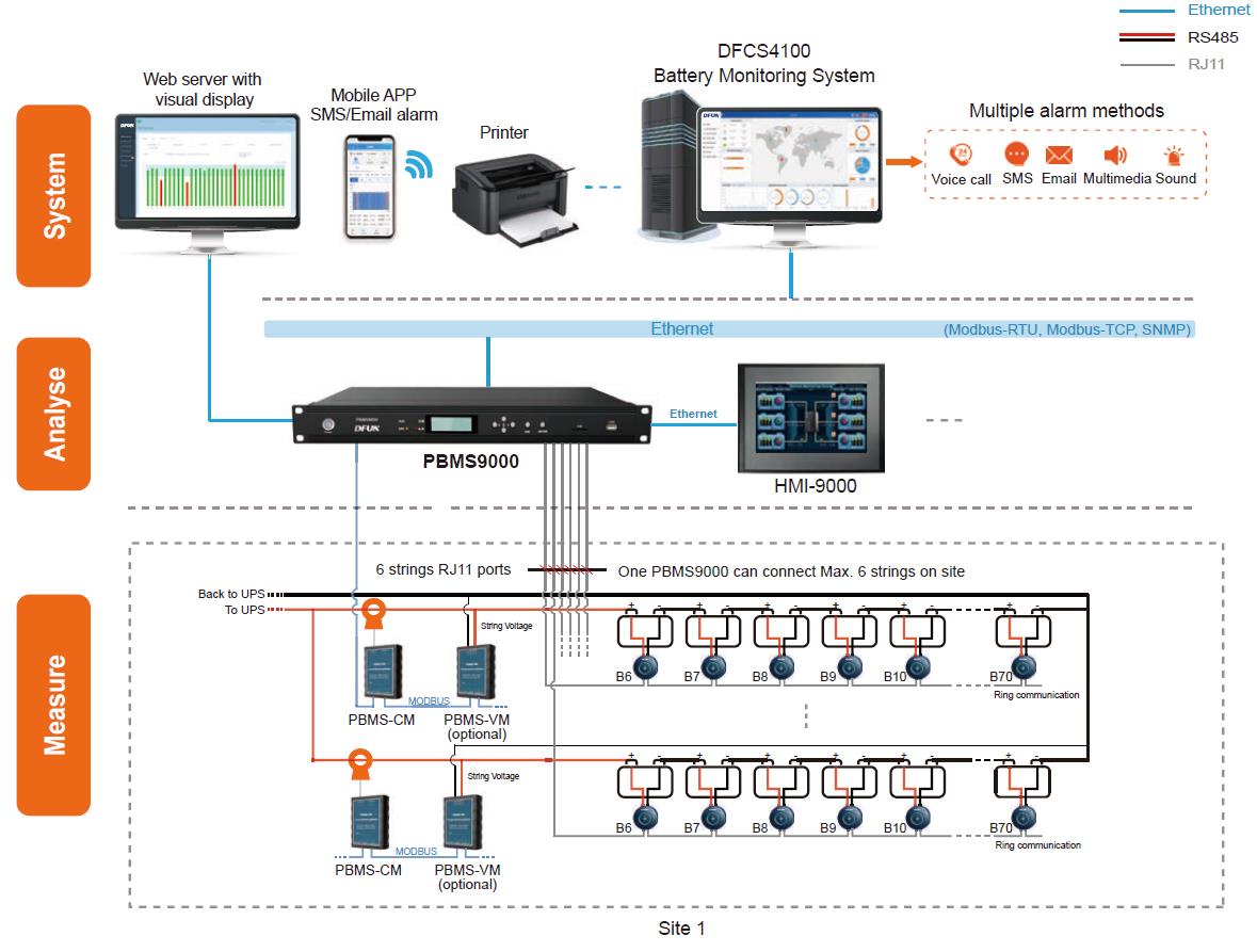 PBMS6000 PRO ใช้โครงสร้างแบบกระจาย 'เซ็นเซอร์หนึ่งตัวสำหรับแบตเตอรี่หนึ่งก้อน' การตรวจสอบแบบเรียลไทม์ออนไลน์ตลอด 24 ชั่วโมง การตรวจจับเซลล์ที่ปิดใช้งานอย่างทันท่วงทีและแม่นยำ การเตือนล่วงหน้า และการขจัดอันตรายด้านความปลอดภัย